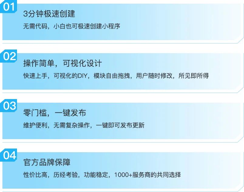 官网小程序是一款帮助用户极速创建官网小程序的产品,无需代码,通过简洁、自由的DIY拖拽,即可轻松设计出心仪的官网小程序;通过数十款组件及其多样式的自由组合,满足各个行业官网的不同设计风格,帮助企业通过低门槛、可视化的DIY设计,高效完成官网建设