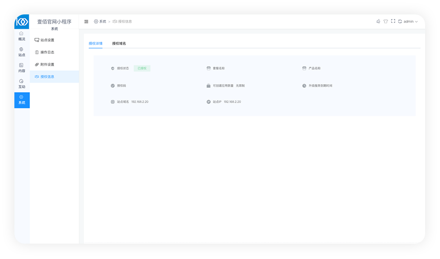 可进行站点设置,域名校验以及填写公司信息。可查看操作日志,设置附件云存储,查看授权信息等。