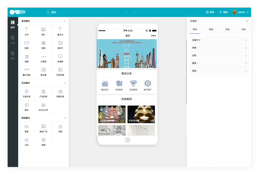 通过各种不同的组件及样式,在可视化的界面中添加内容和编辑页面效果,操作简洁,功能强大