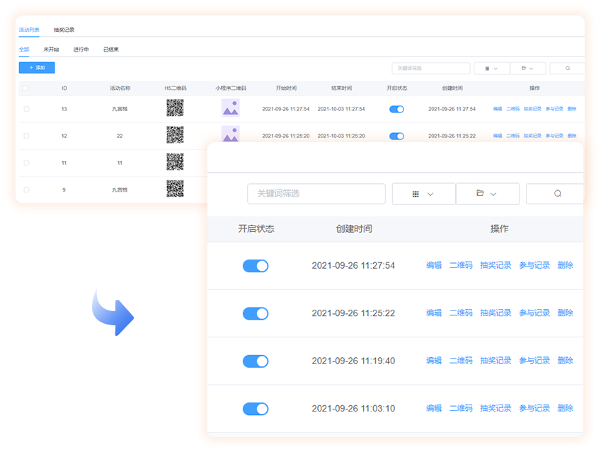 在门店后台--营销--九宫格,可创建九宫格活动,活动列表操作列支持编辑互动,查看活动二维码,查看抽奖记录、参与记录等操作。