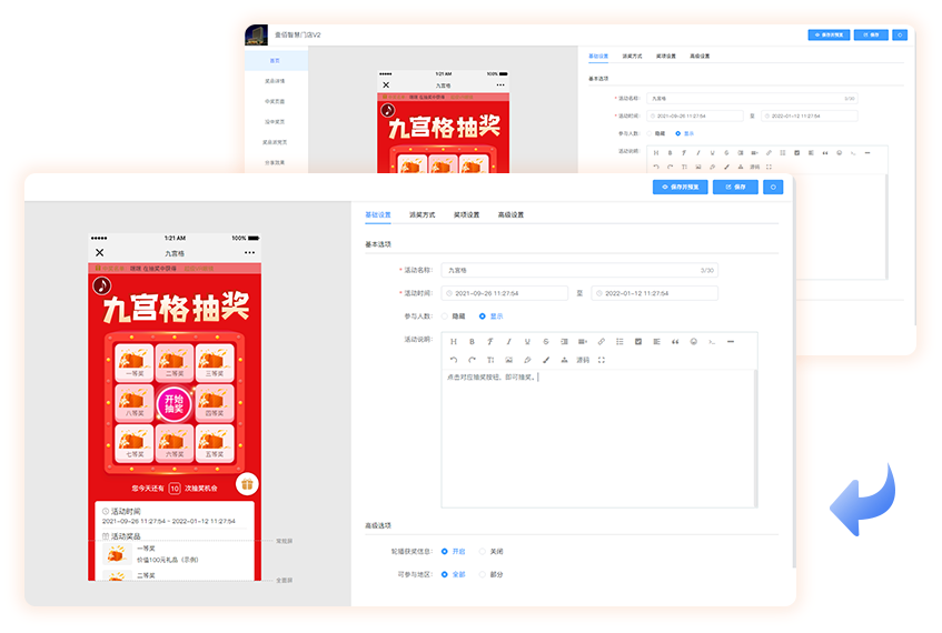 点击活动列表编辑操作,可进入活动编辑页面,实时查看移动端活动预览,支持设置活动基础信息,派奖方式,活动奖项,活动分享等信息。