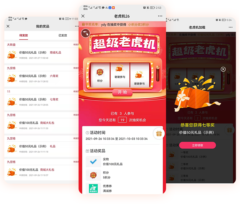 新的互动营销活动又上线啦,为了进一步帮助商家打造互动性商城营销活动,保证对用户的长期的吸引和运营,包括老虎机抽奖在内,我们近期已经上线了九款互动抽奖插件,通过对经典线下活动的复刻,丰富了商家获取新客户、激活老客户的营销手段。通过实物、积分、商品、优惠券等多样的奖品支持,使用户产生较强的代入感,帮助商家通过营销活动创造更大的价值,促进业务转化,带动会员线下领取实物、线上消费积分,增加商城商品曝光度、提升商品销量。