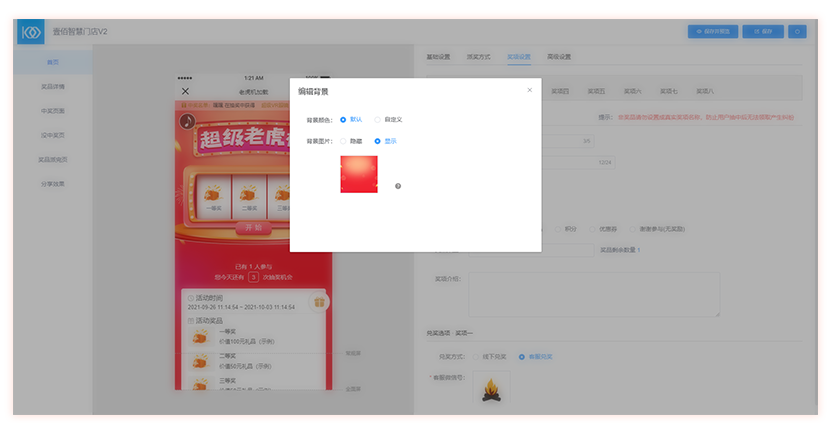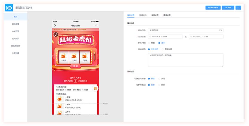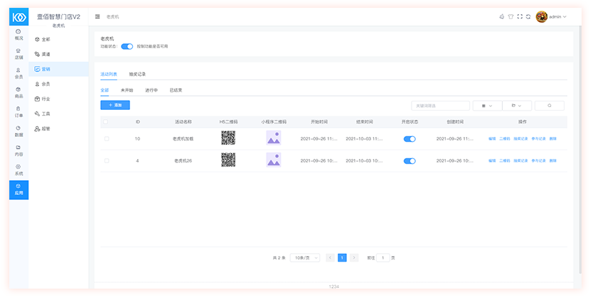 ◆ 商家在后台--应用--老虎机插件,可以创建活动,并支持查看和下载活动二维码,查看活动抽奖结果等操作。