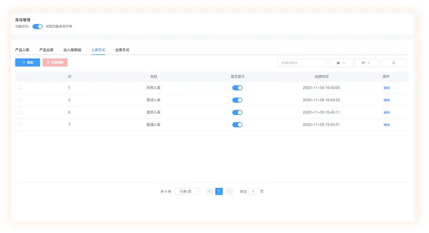 ◆ 商家在后台开启库存管理后,创建商品时可录入库存,生成一条商品的初始化库存入库记录。