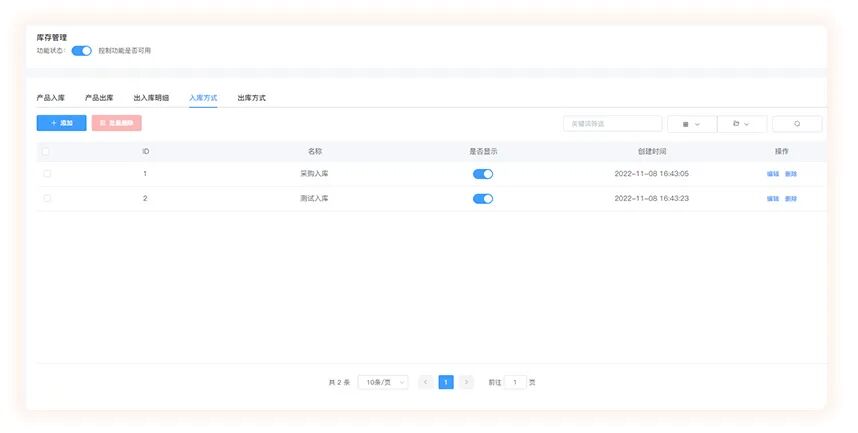 ◆ 库存管理默认支持的入库方式有:初始化库存入库、采购入库、退货入库;支持的出库方式有:销售出库、报损出库。商家也可以创建自己的出入库方式。
