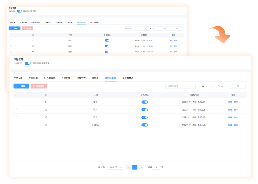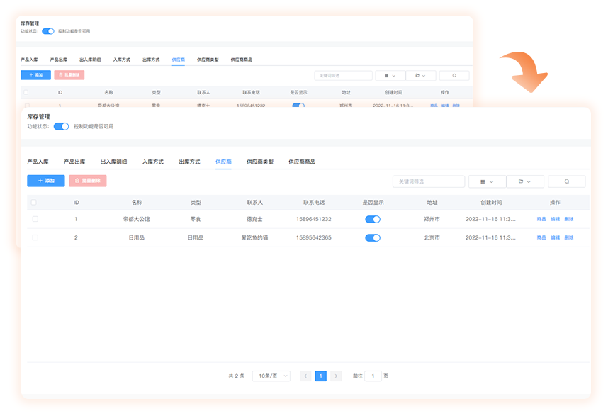 ◆ 商家在后台应用--供应商管理插件,可为供应商创建不同的类型,方便对供应商进行分类管理和查询