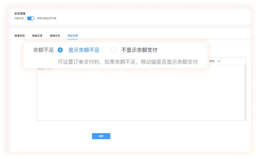 ◆ 商家在后台会员储值功能的基础设置页面,可选择开启组合支付功能