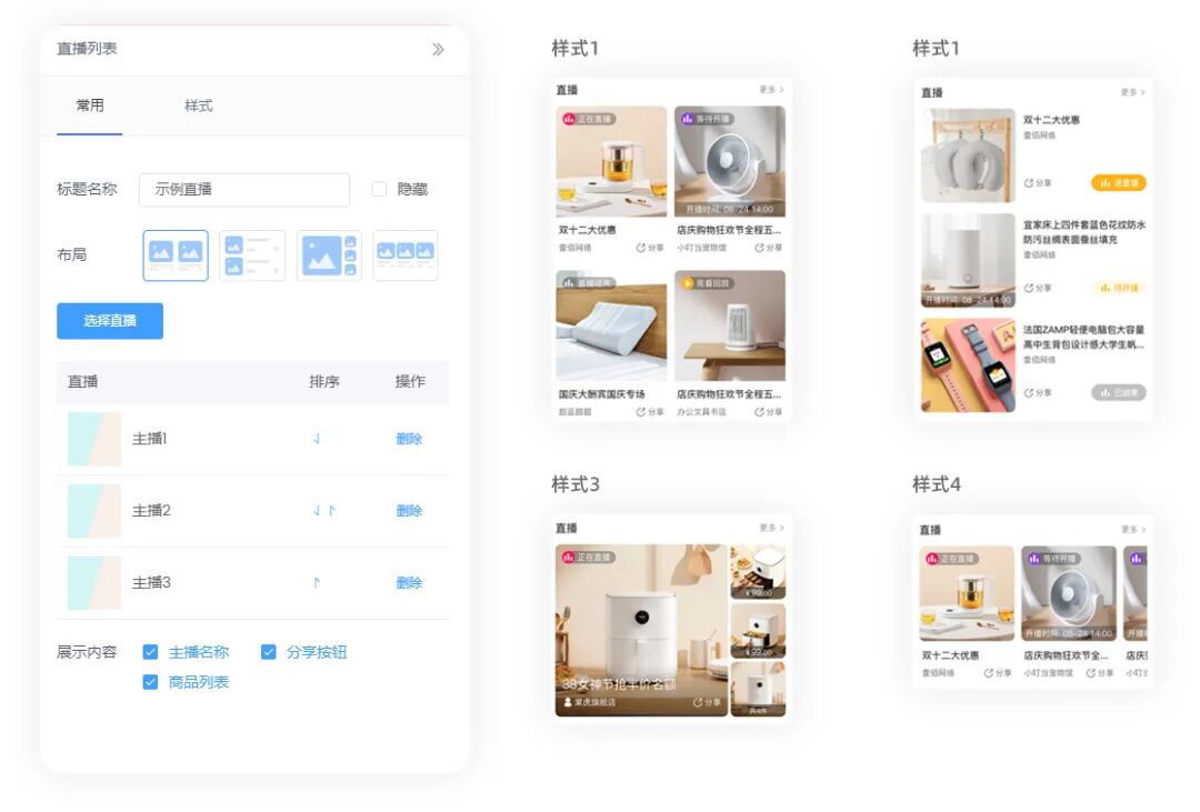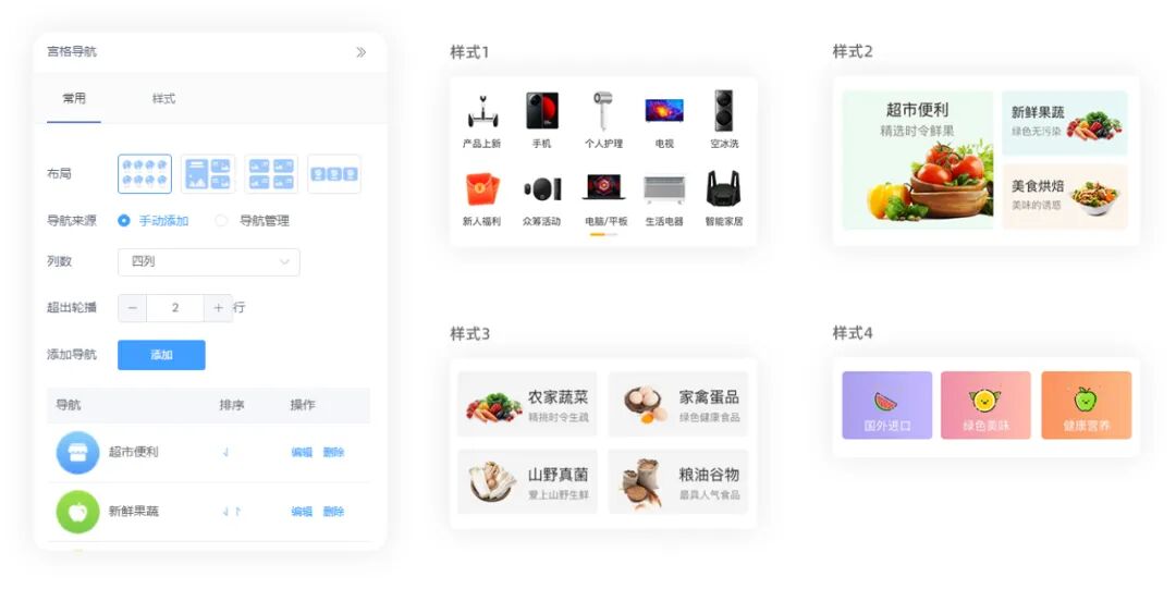 在门店DIY原有大量样式基础上,本次优化为所有组件新增布局选择操作,让组件的样式选择变得更加简单直接,各组件设置项更加统一美观,后续会支持更多常用布局和样式,让用户用起来更简单