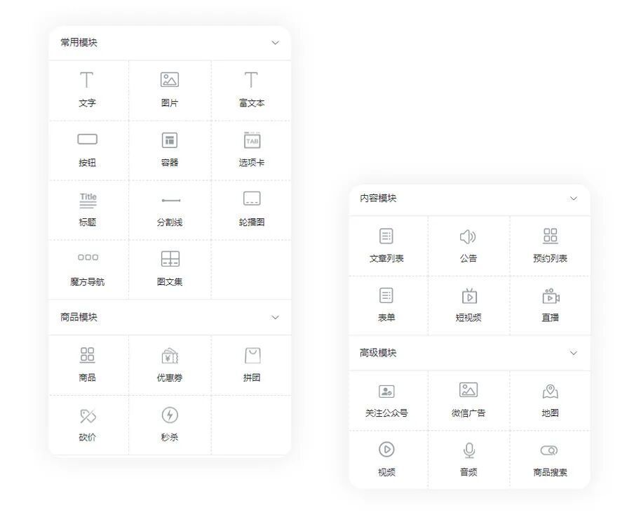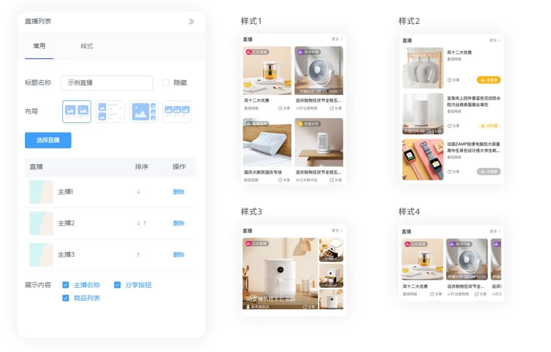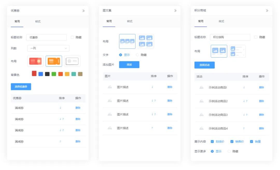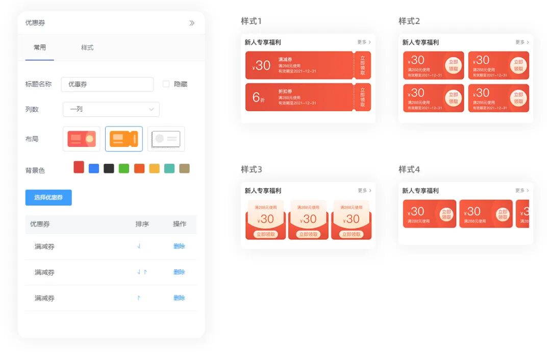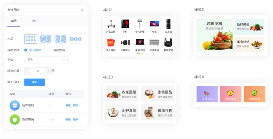 我们为DIY系统增加布局选择,让组件的样式选择变得更加简单直接,各组件设置项更加统一美观。后续我们会支持更多更美观的常用布局和样式,让客户更简单的搭建个性化风格。