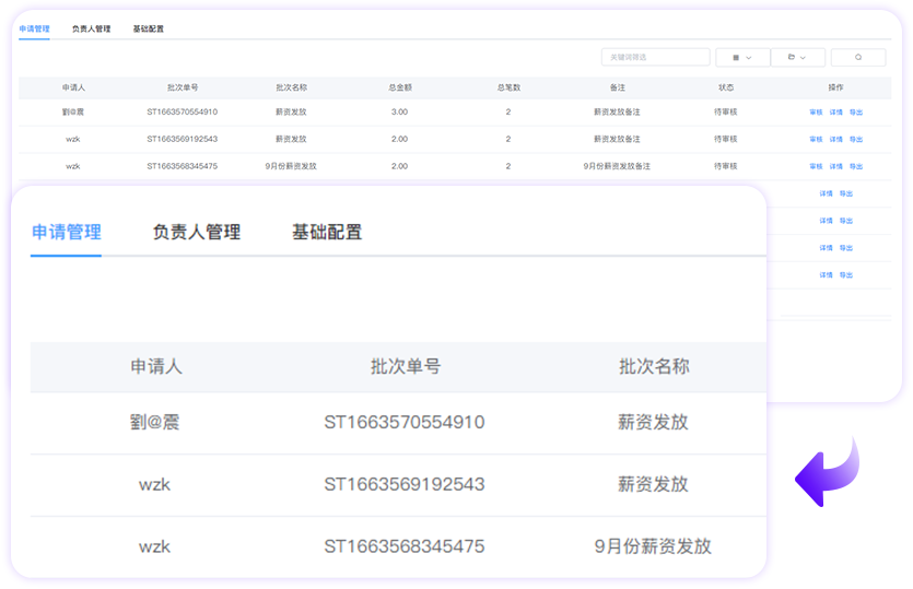 ◆ 后台薪资发放插件基础设置中可设置批次提交提醒接收用户,负责人在移动端提交发薪批次后,后台设置的管理员会接收到批次提交审核的提醒,管理员进入后台可查看批次详情和审核发薪批次,支持导出批次信息。