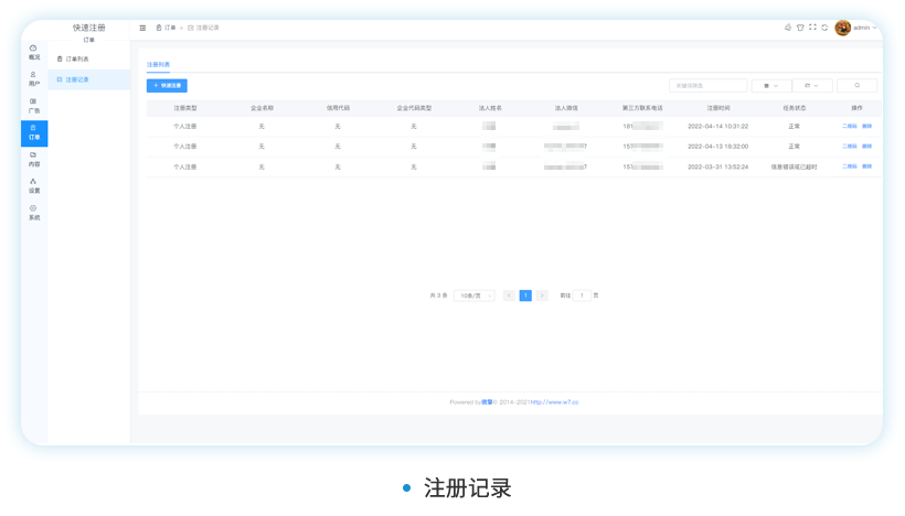 平台后台可查看小程序注册支付的订单,包含企业订单和个人订单两种类型,并支持查看注册记录