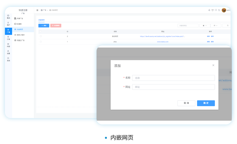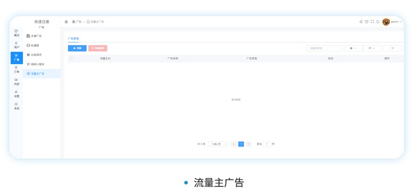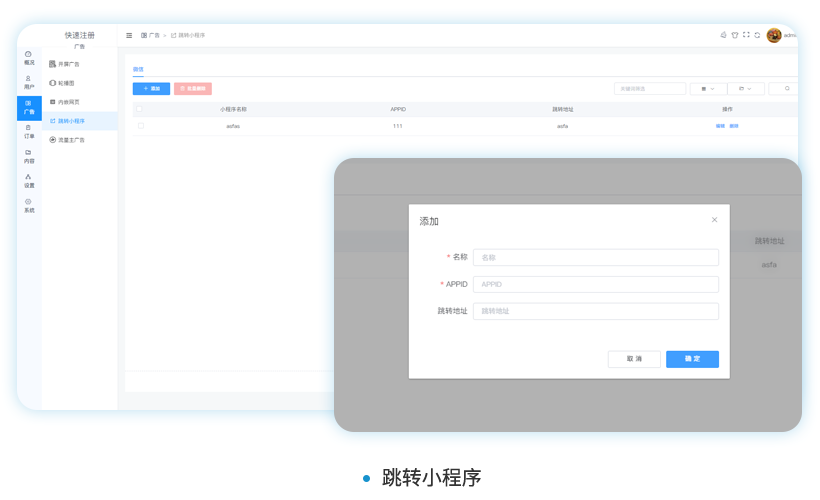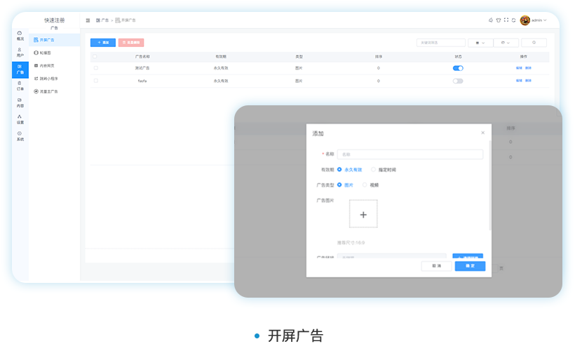 平台后台支持广告管理,包含开屏广告、轮播广告、内嵌网页、跳转小程序、流量主广告等功能
