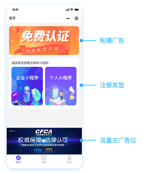 小程序注册助手首页包含轮播广告、小程序注册类型、流量主广告位: