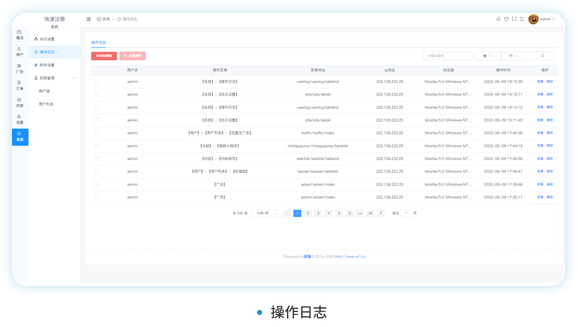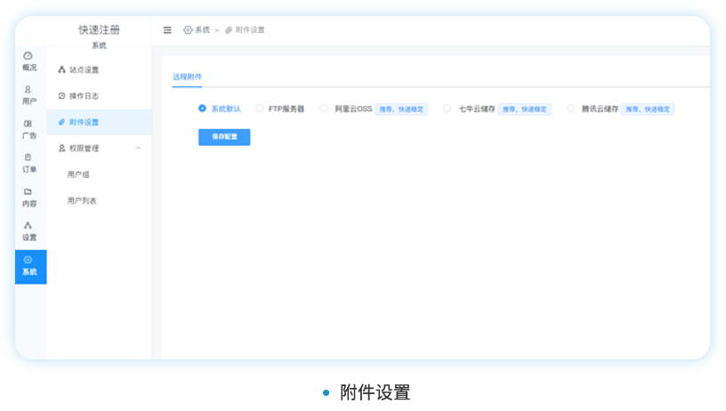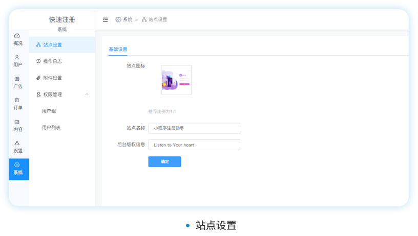 平台支持对后台站点进行自定义设置,查看操作日志,对系统附件进行设置,以及管理平台用户权限等