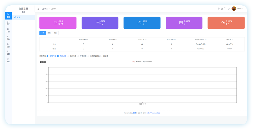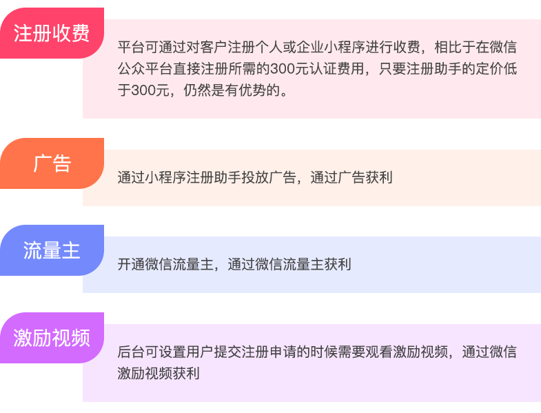 小程序注册助手是一款帮助客户注册微信小程序的产品,使用小程序注册助手可免除300元的微信小程序注册费用,通过简单的信息填写即可完成免费的微信小程序认证。支持免费注册企业小程序和个人小程序两种。后台支持设置免费或收费注册、激励视频、流量主广告、轮播广告等经营功能。