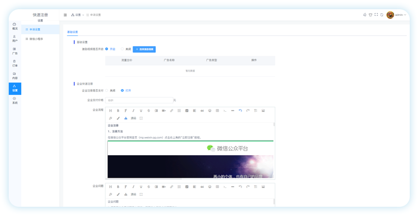 平台支持申请设置激励视频、设置注册价格以及自定义填写注册流程和常见问题。