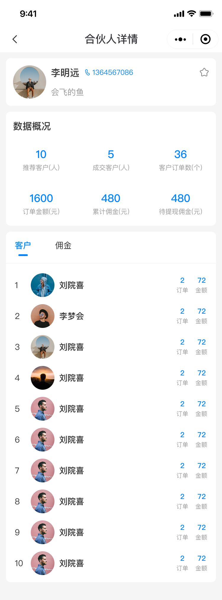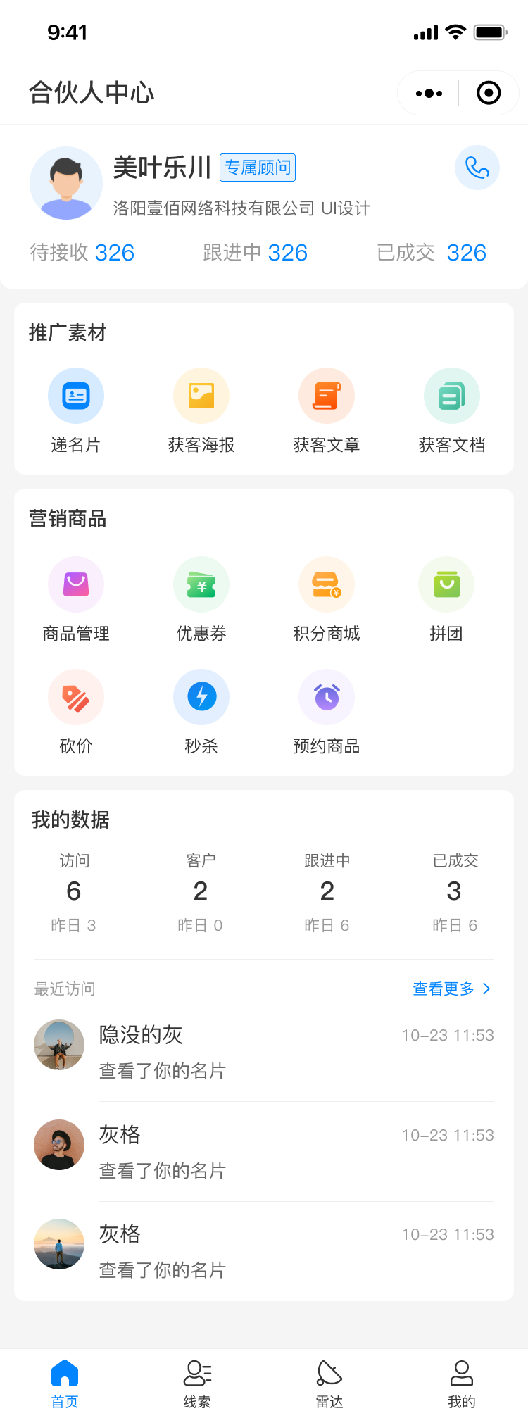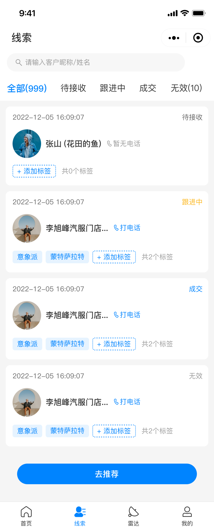 销售收到客户线索后,可以一站式管理转线索客户,按照“待接收、跟进中、成交、无效”四个状态进行流转,及时向合伙人同步进度,让销售更加清晰可见。