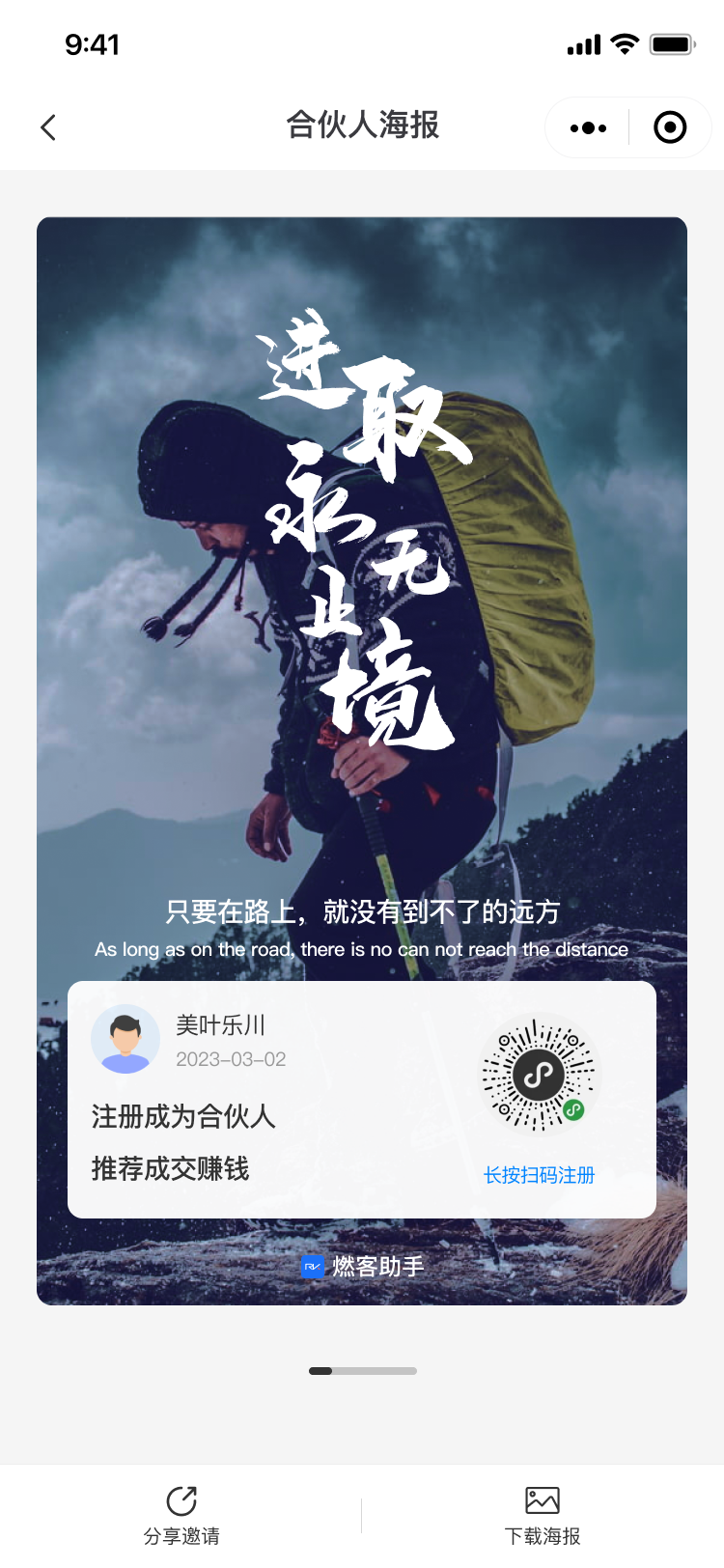 合伙人可通过微信、海报进行分享,合伙人也可以通过分享企业物料(企业文章、海报、相关文档、商品等)进行获客并可获得相应佣金奖励。
