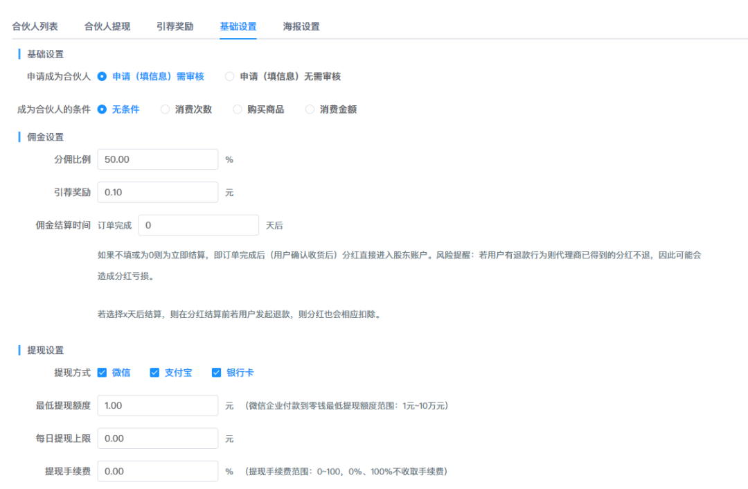 企业需要先在系统后台进行合伙人的基础设置,选择成为合伙人的条件以及是否需要进行合伙人信息资质审核。
