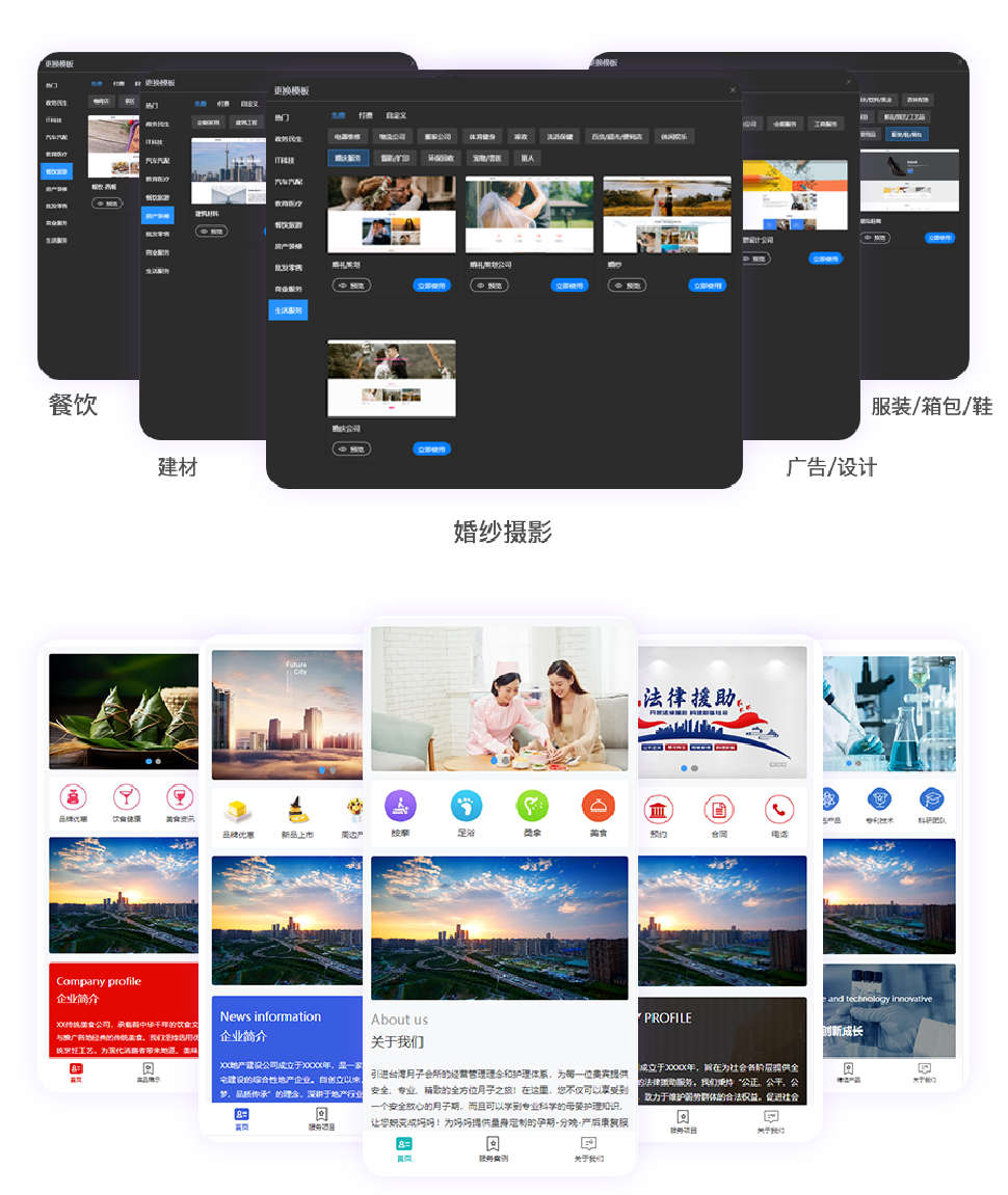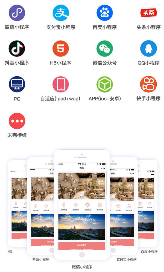 已支持和覆盖PC、H5、微信、支付宝等13大平台,站点内容互通共用,一个产品全方位满足客户全平台PC建站和小程序制作需求。