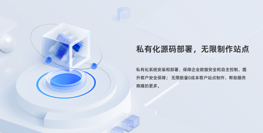 私有化系统安装和部署,保障企业数据安全和自主控制,提升客户安全保障;无限数量0成本客户站点制作,帮助服务商赚的更多。