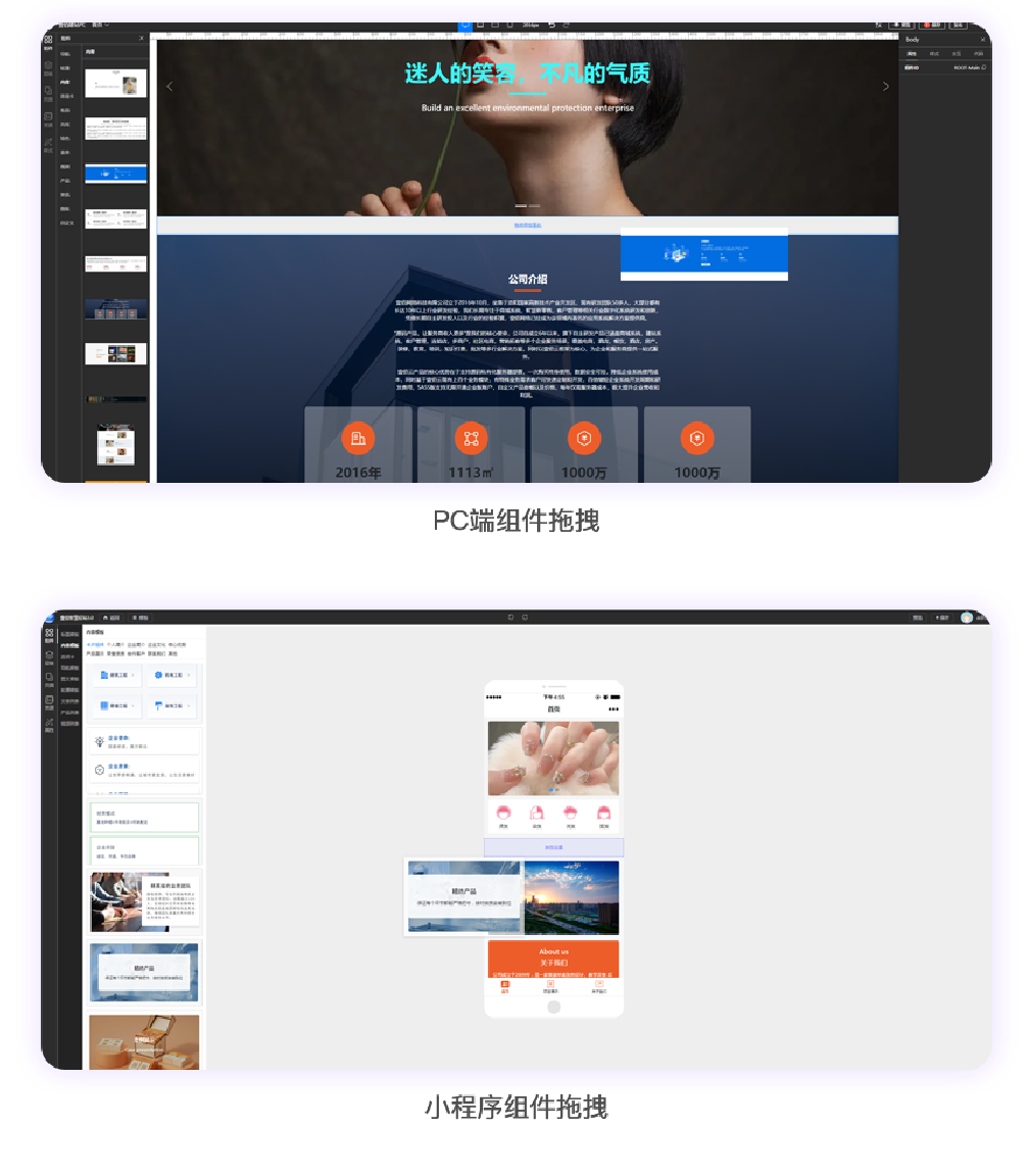 全拖拽式操作,所见即所得,使用简单,让建站和小程序制作如同搭积木般简单快捷,一分钟即可快速生成网站和小程序,极大压缩开发成本与交付时间。