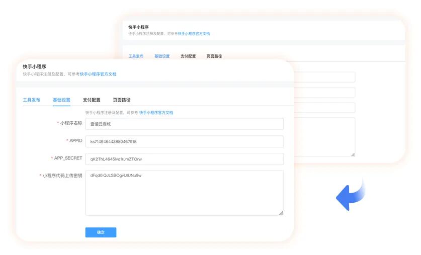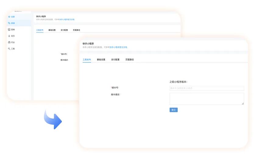 壹佰智慧门店V3后台应用中心--渠道:增加快手小程序渠道,支持工具发布、基础设置、支付配置、页面路径等功能