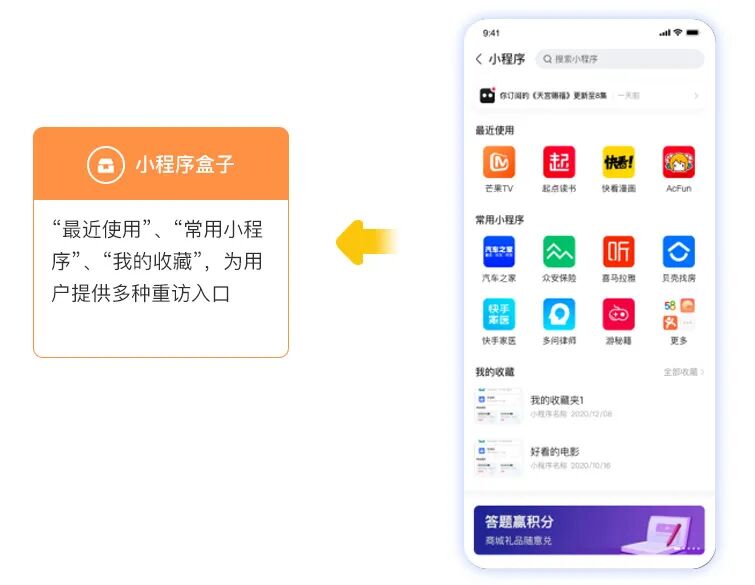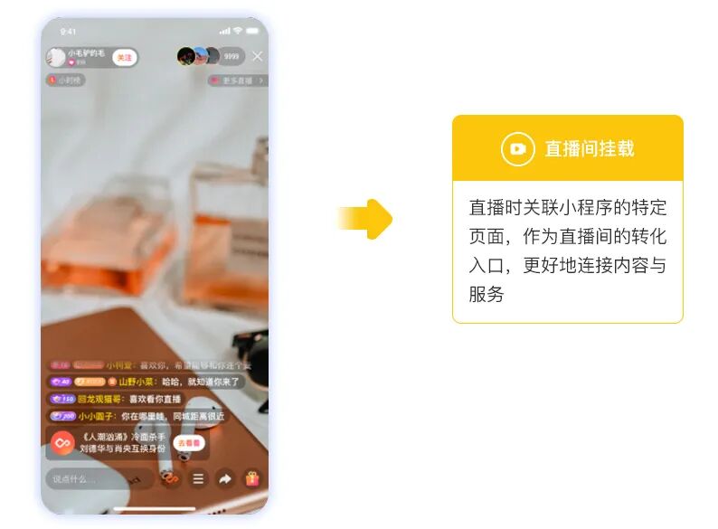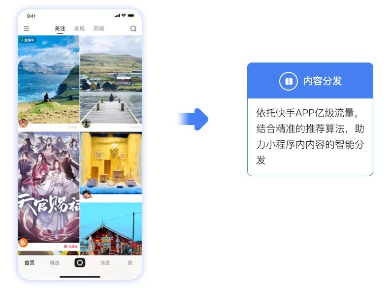 快手小程序提供多场景流量支持,包括但不限于:搜索、信息流推荐、短视频挂载、直播间挂载、站内分享、服务通知、小程序盒子