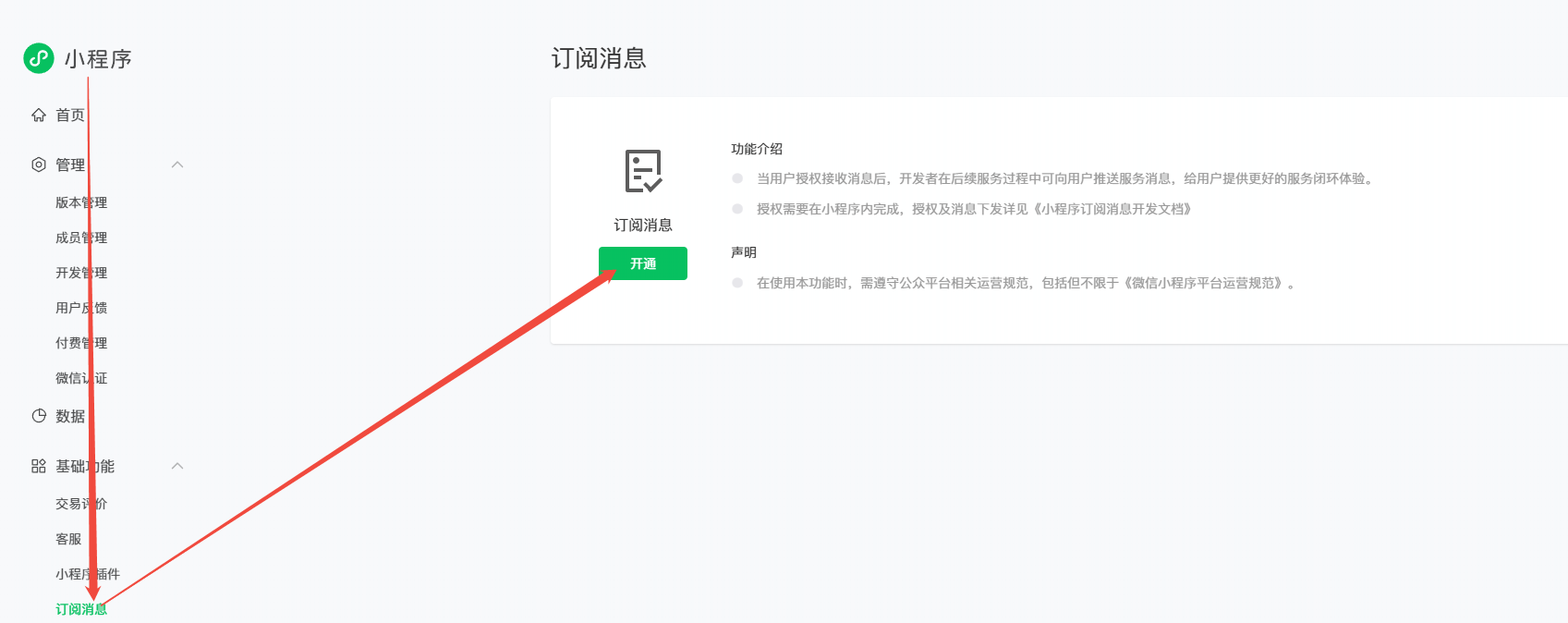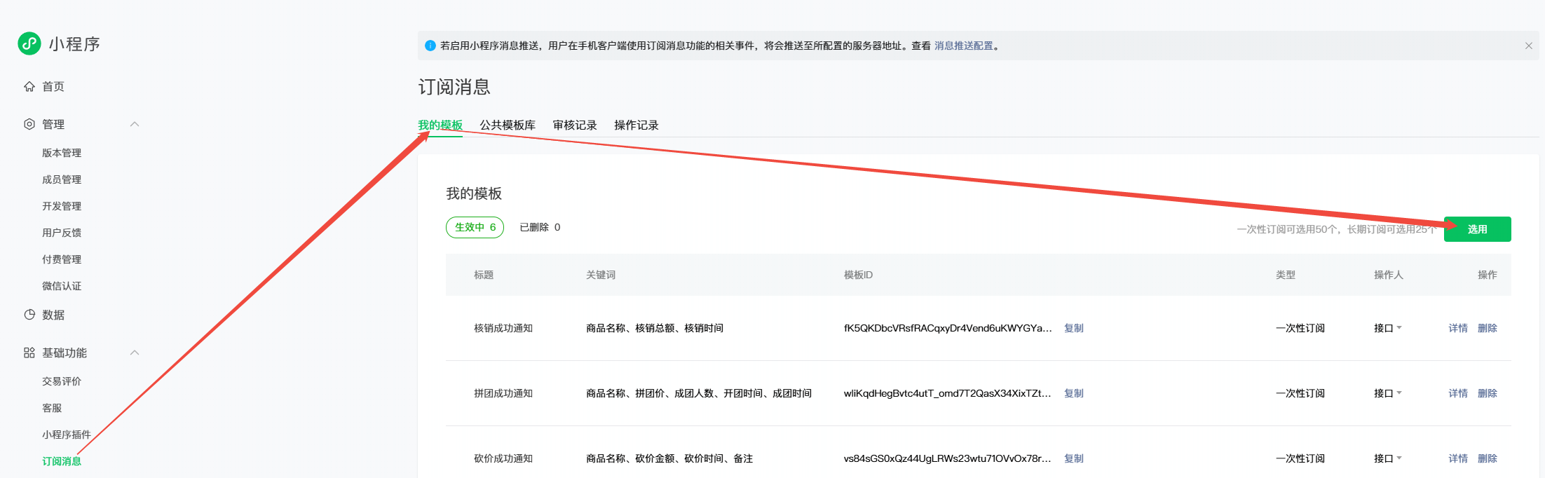 三、在微信小程序公众平台,打开【基础功能】-【订阅消息】-【开通】--【选用】