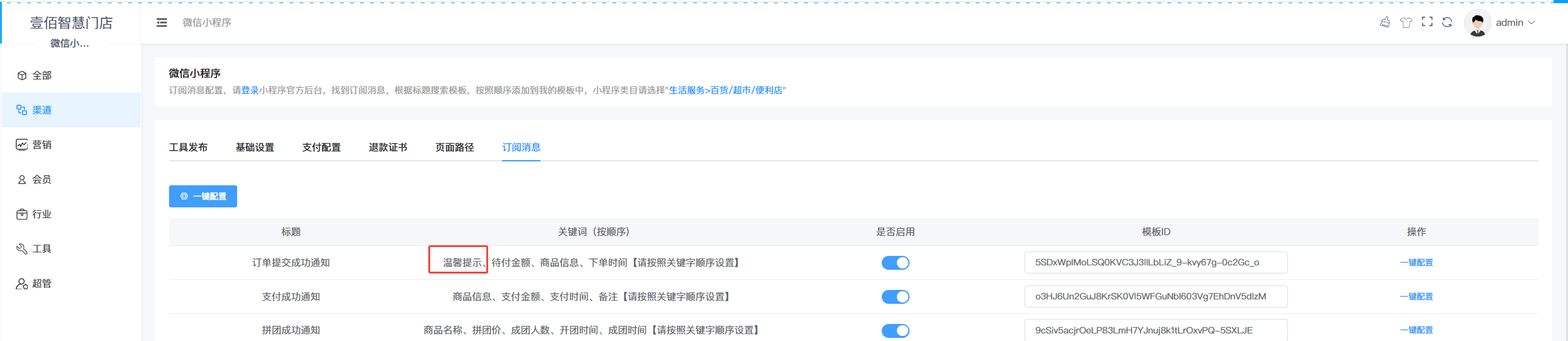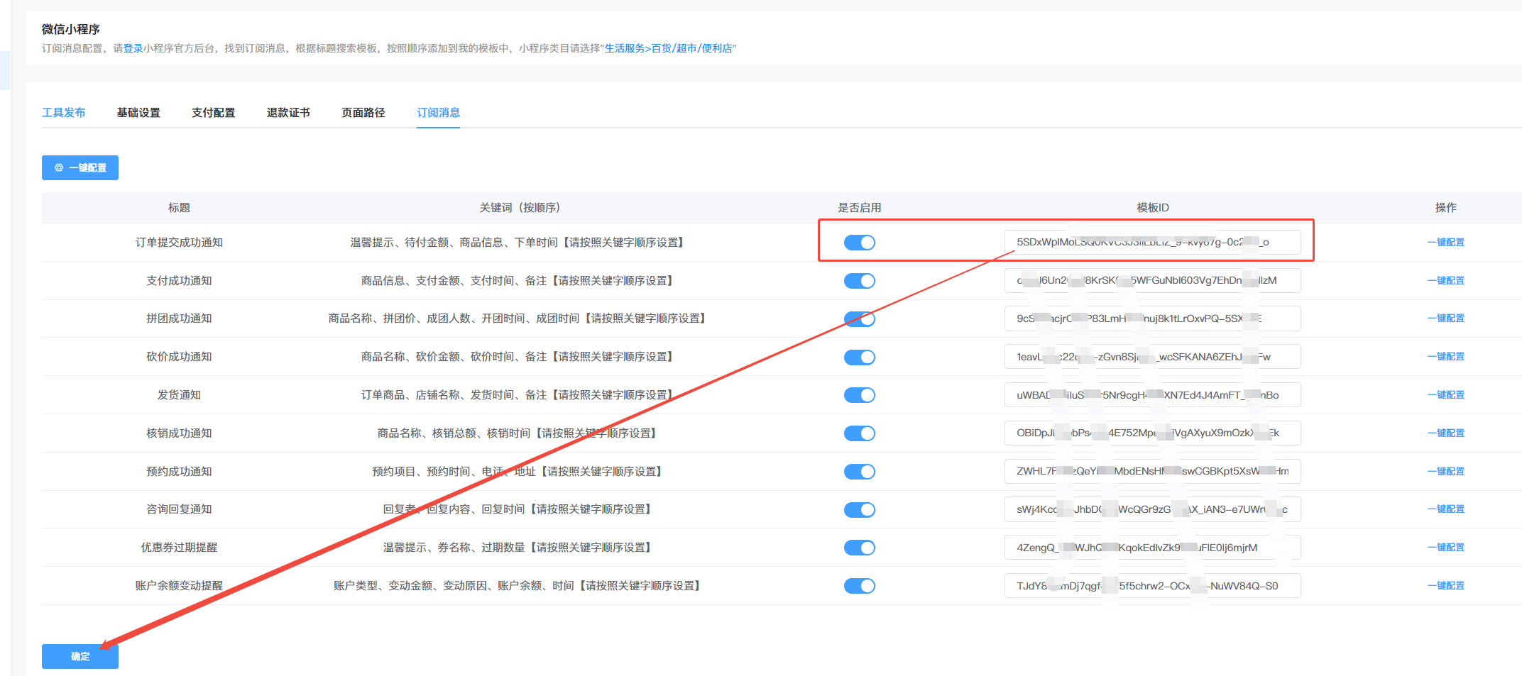 八、将生成的模板ID复制到门店V2后台,同时点击开启按钮并【保存】