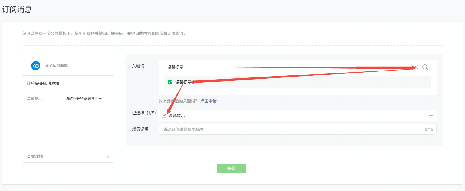 六、在公众平台【配置关键词】中搜索【温馨提示】,然后勾选