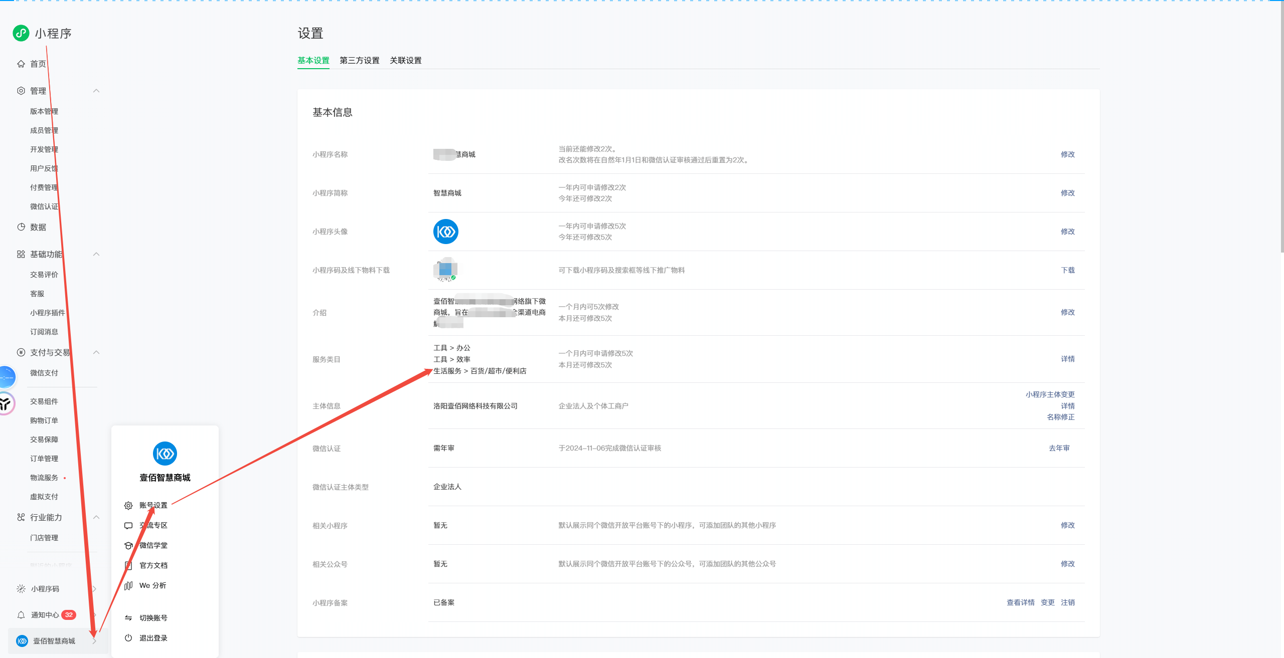 二、登录微信小程序公众平台mp.weixin.qq.com,添加小程序类目【生活服务-线下超市/便利店】,如有添加可直接进行下一步。没有的话需添加一下对应类目