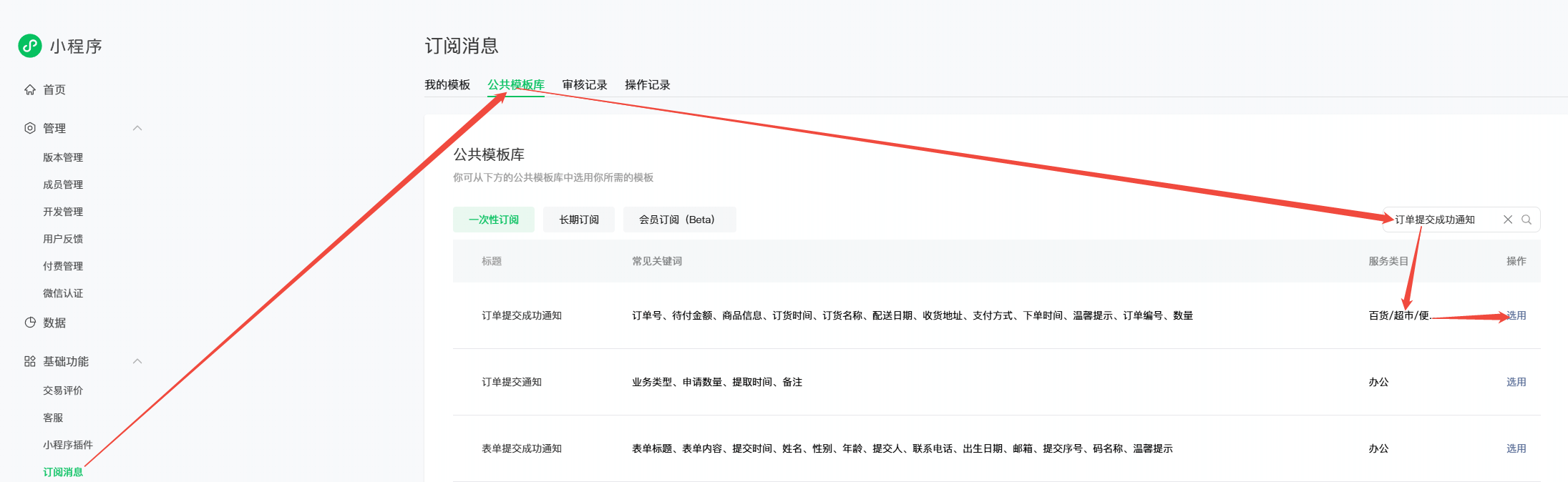四、搜索【订单提交成功通知】,在搜索结果中定位到服务类目为【生活服务-线下超市/便利店】的订阅消息,然后【选用】