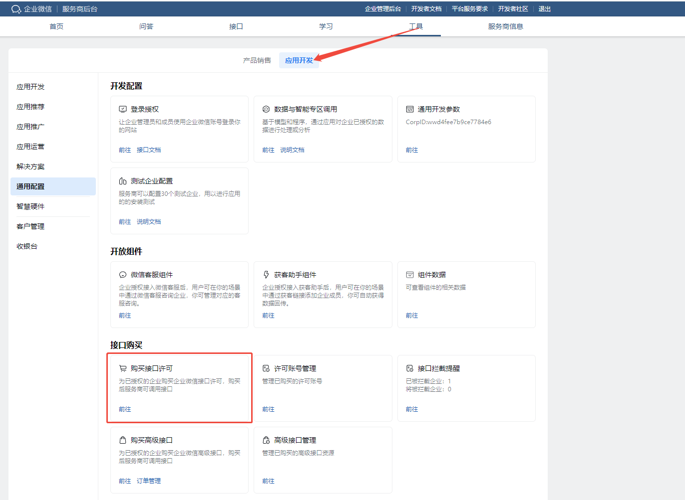 一、需要联系服务商,登录服务商后台https://open.work.weixin.qq.com/,【工具--应用开发】---【购买接口许可】----【购买】