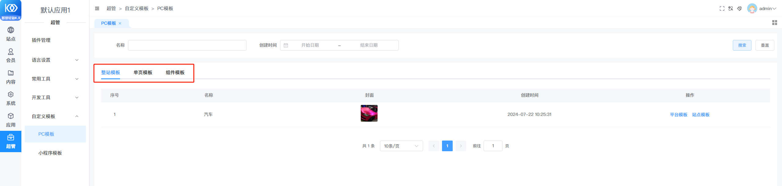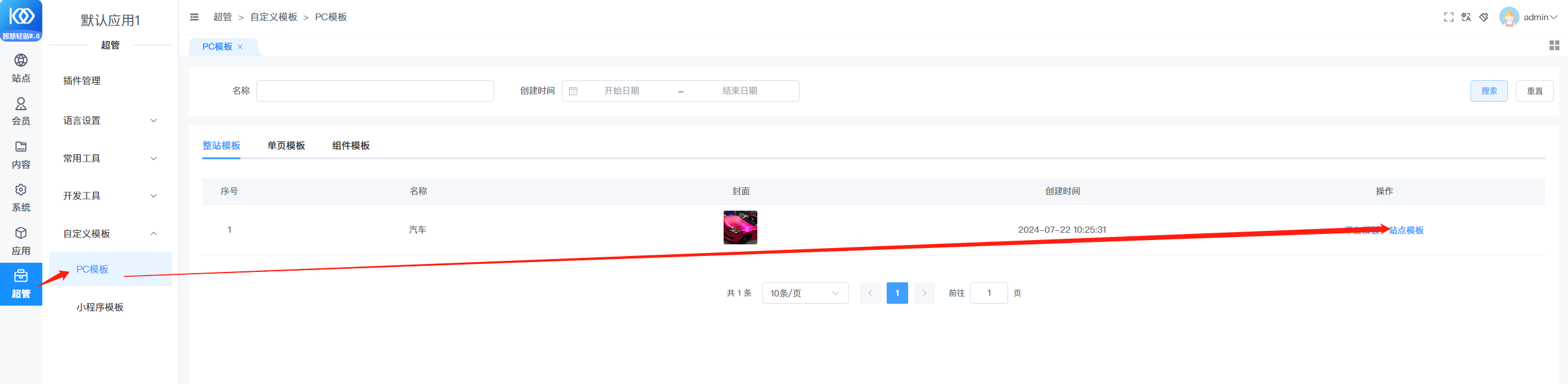 三、超管审核模板。超管登录后台,在【超管--自定义页面--pc模板】菜单下,点击提交成 站点模板