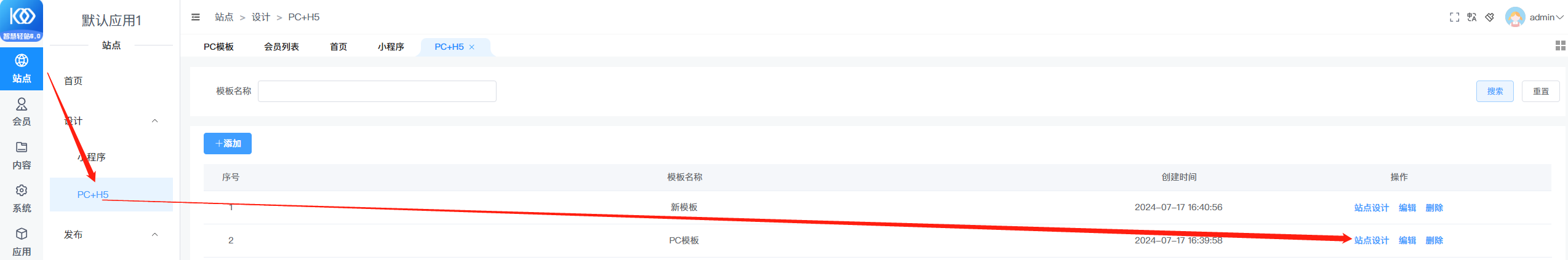 一、客户提交模板 【站点-pc+h5】菜单下,进入站点设计页面。