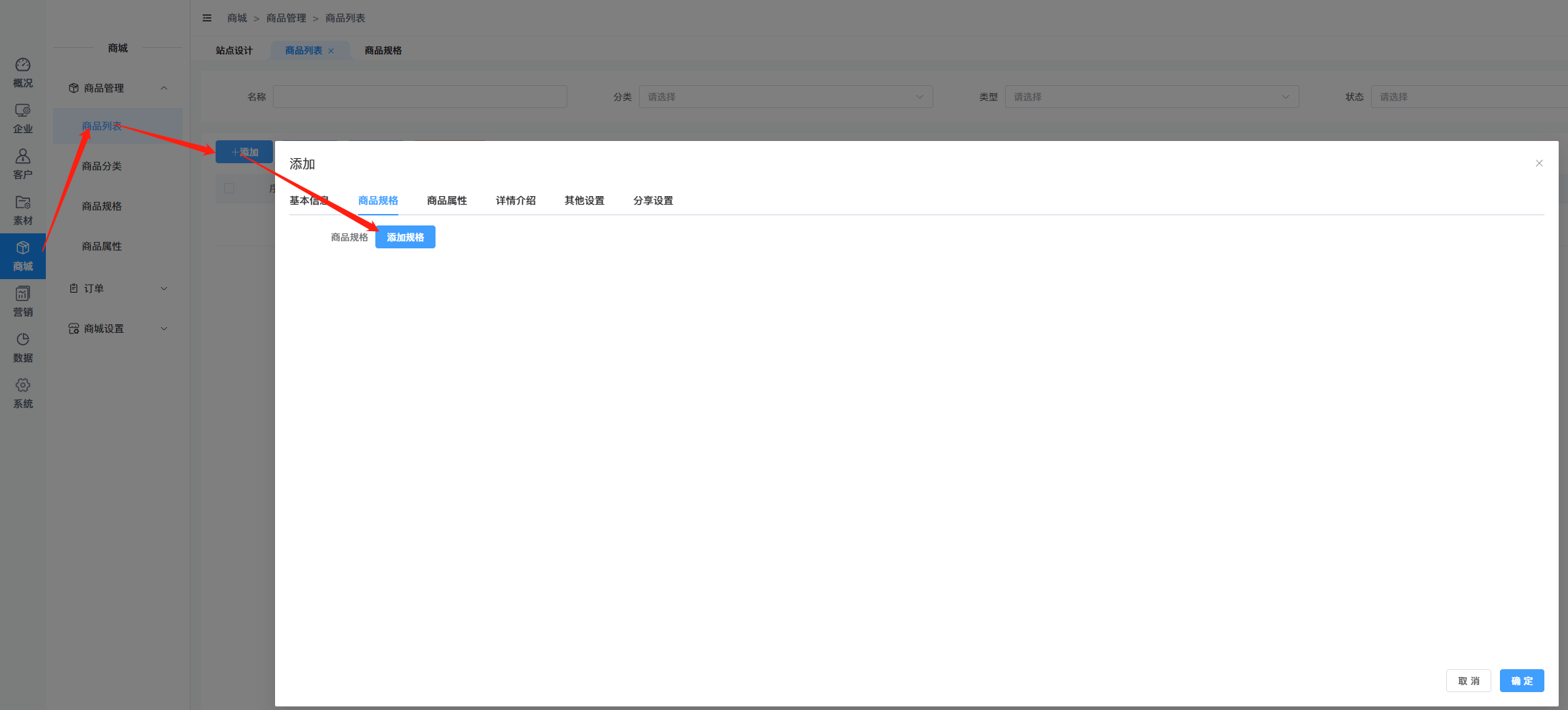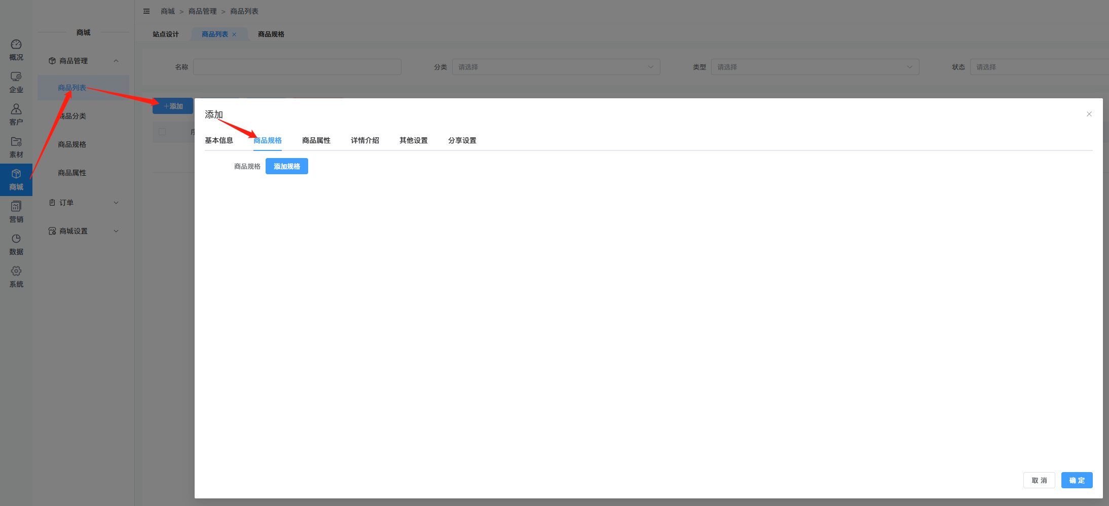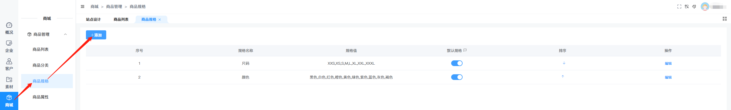 方式二:在【商城】-【商品规格】菜单下,添加商品规格