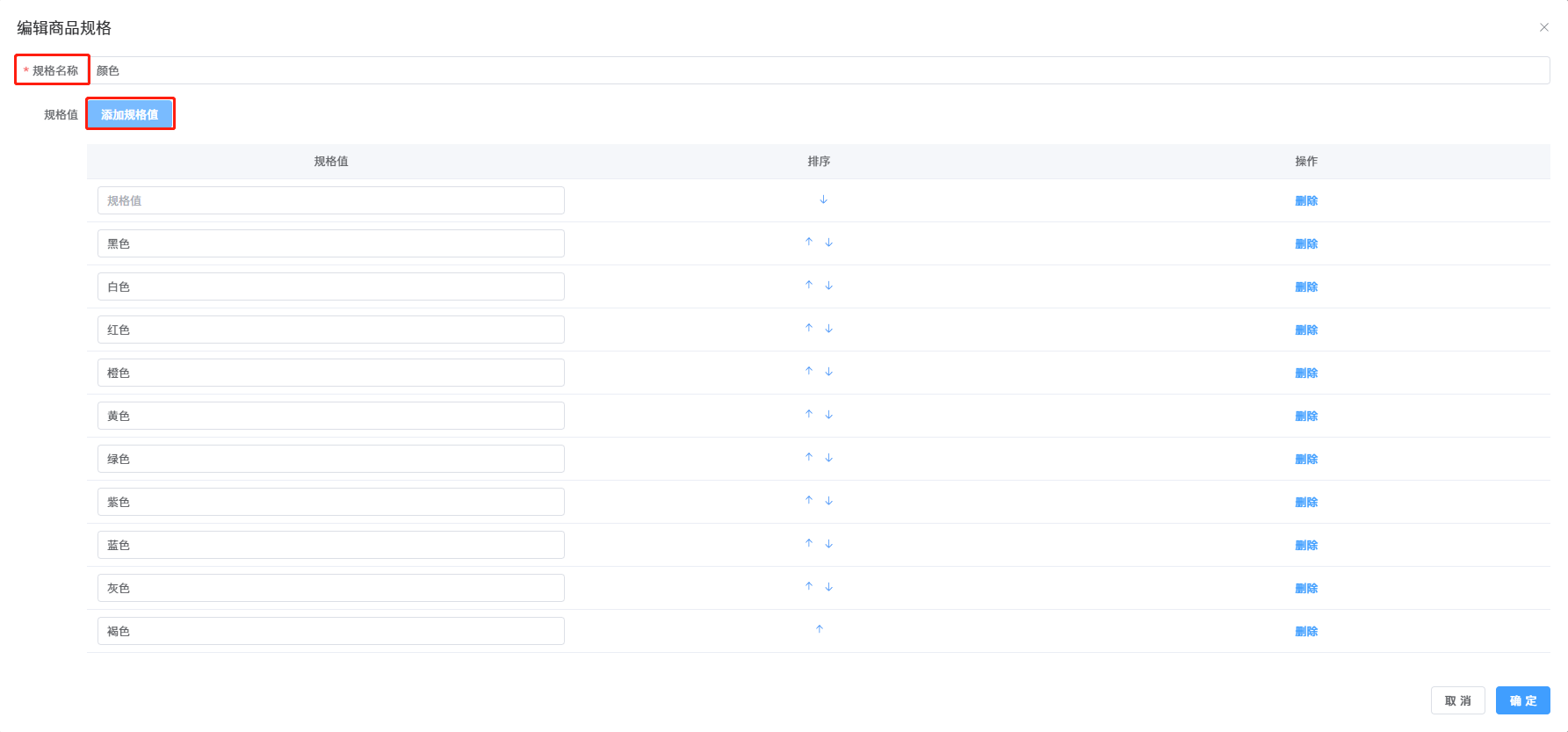 二、弹窗框中,填写规格名称和规格值,颜色为例,如下图所示