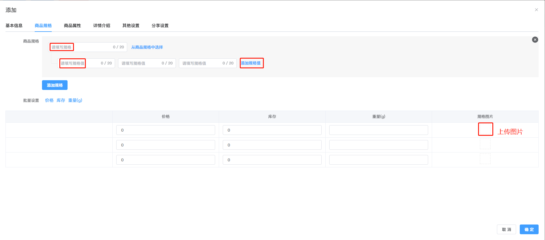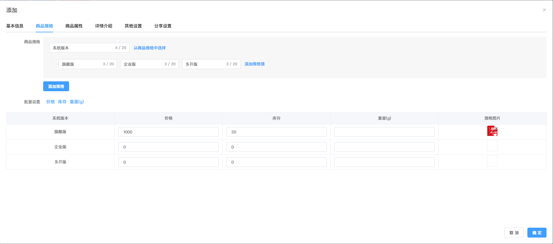 以版本为例子,填写规格名称、添加规格值并填写。设置每个规格的价格、库存、上传商品主图【图片尺寸1:1 正方形图片】