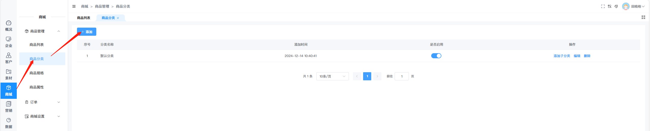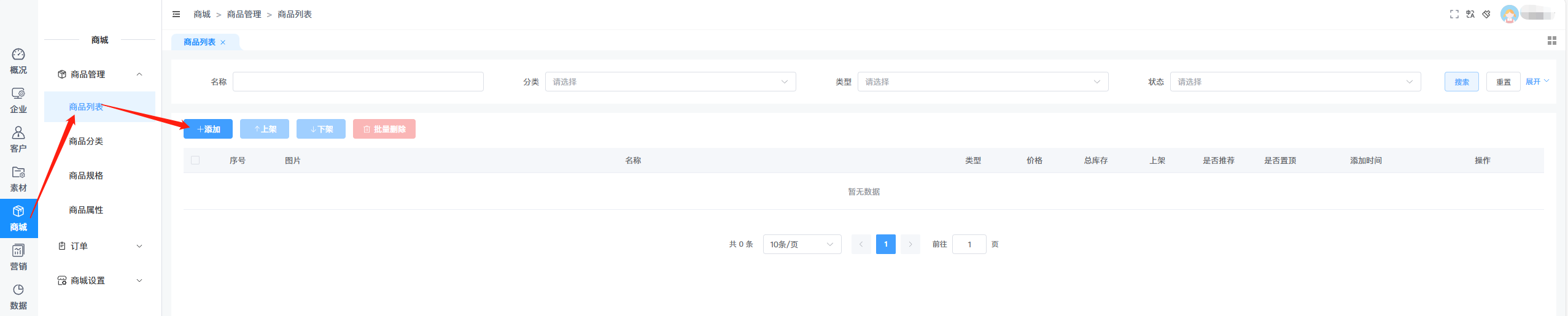 一、登录后台,在商品列表添加商品【点击商城--商品列表菜单】