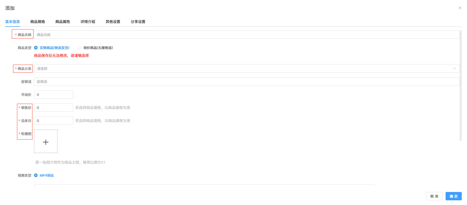 二、在弹窗框中填写:商品名称、选择商品分类、商品价格、库存、上传商品图等,点击确定商品就添加好了。剩下商品重复以上操作添加即可。