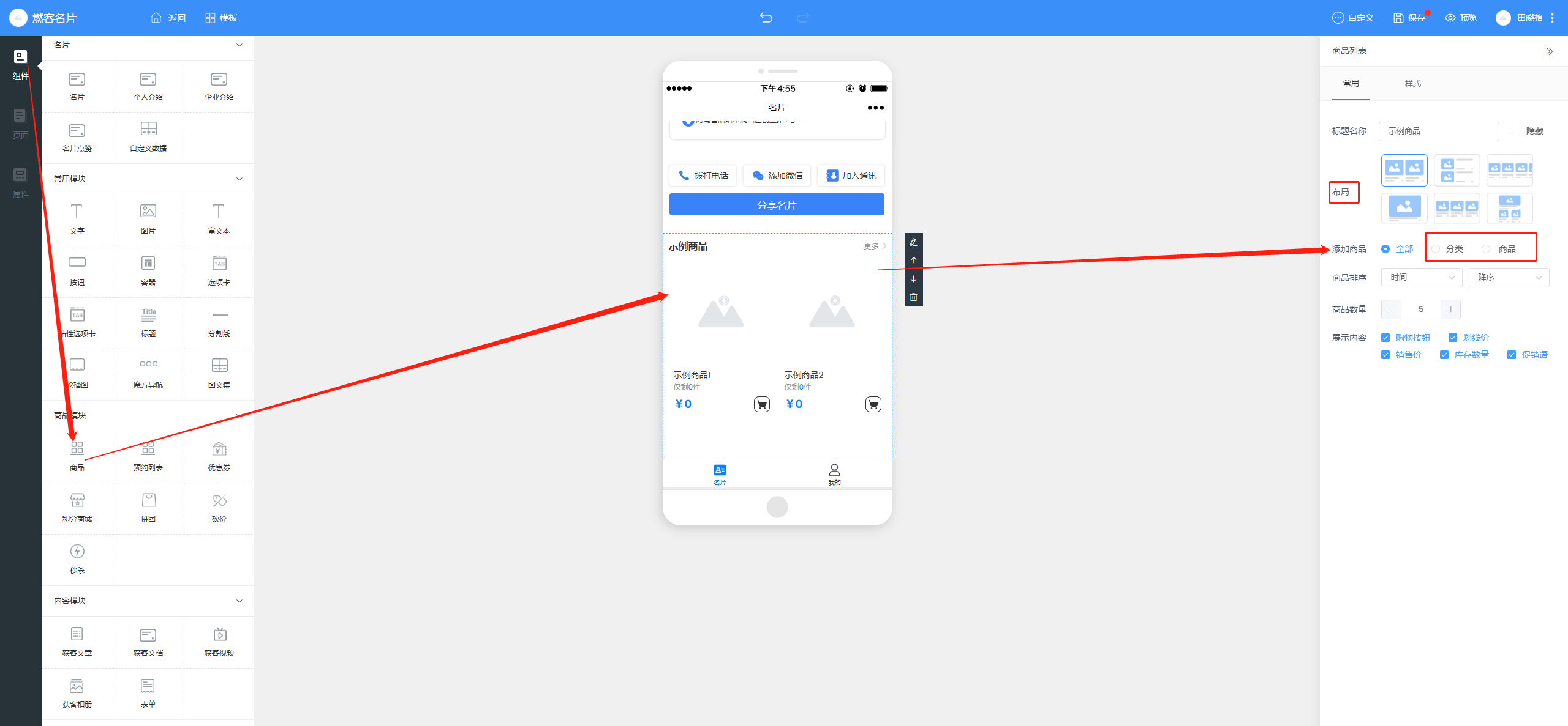 组件--找到商品组件--拖拽到设计页面--在右侧常用菜单下,可以选择商品展示的布局和展示方式【分类展示 还是指定商品】