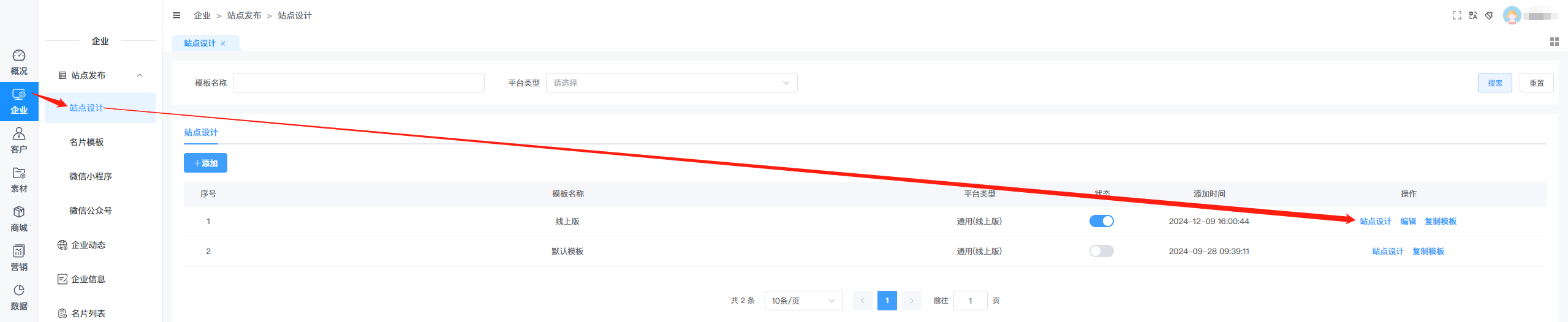 三、调用后台添加好的商品。企业--站点设计 找到使用的模板,进入设计页面