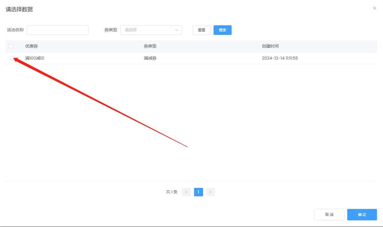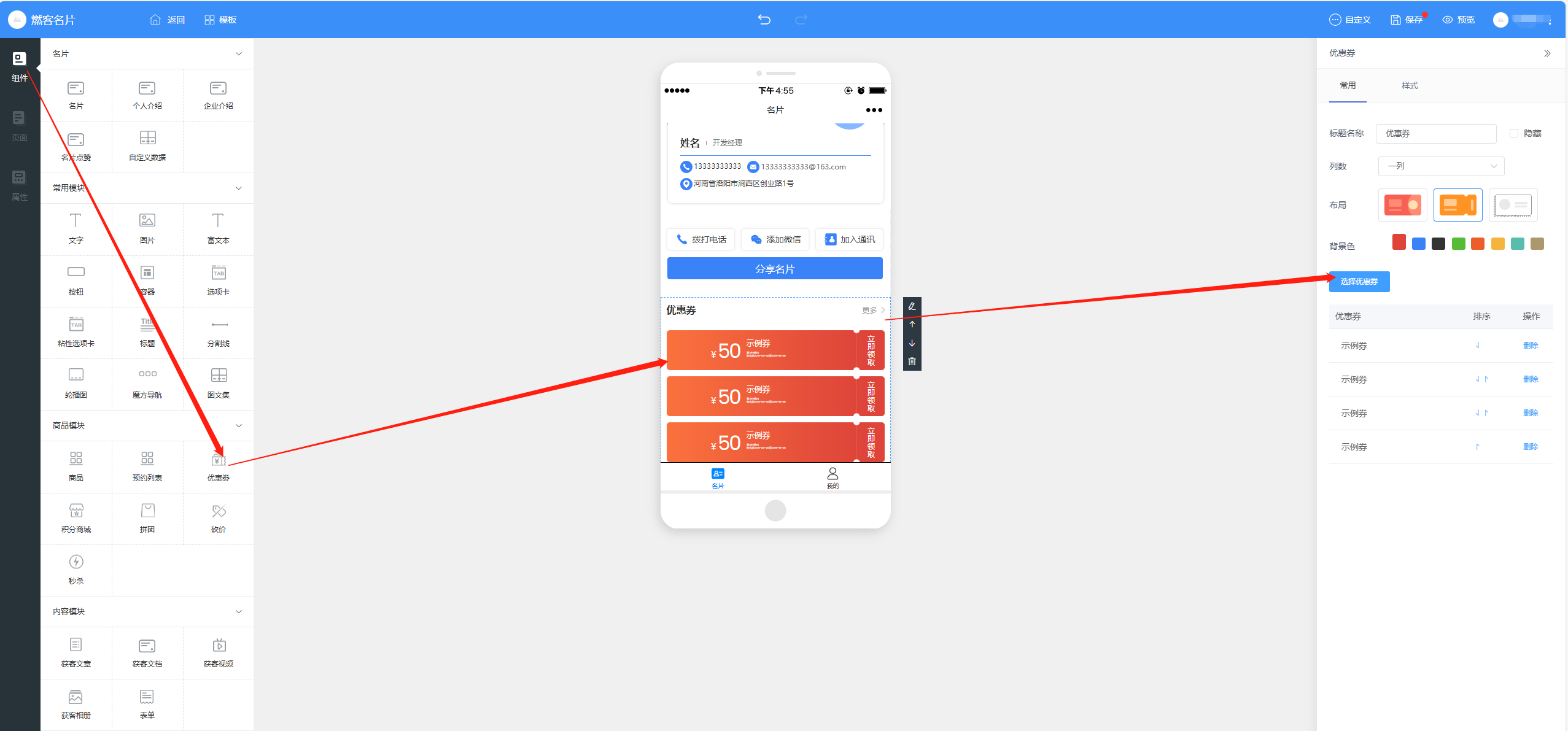 找到优惠券组件,选择后台已经添加好的优惠券