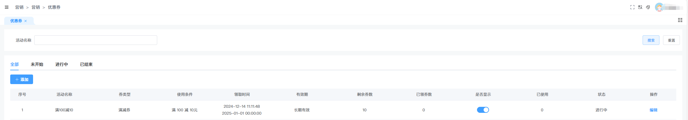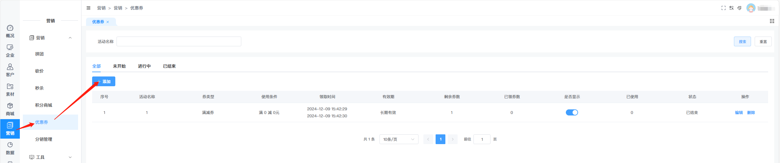 一、在后台,营销菜单下,先添加优惠券