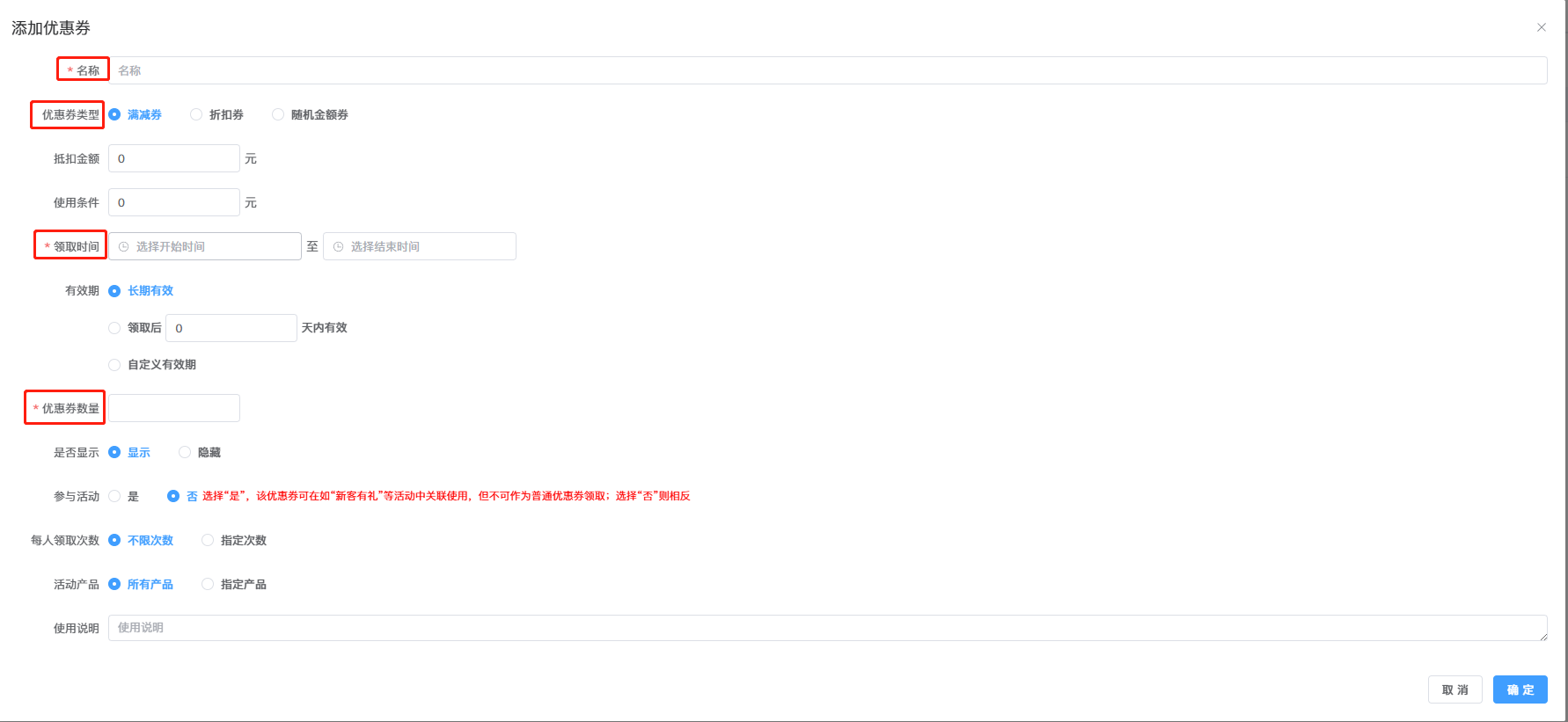填写优惠券名称、选择类型、领取时间、设置优惠券数量等