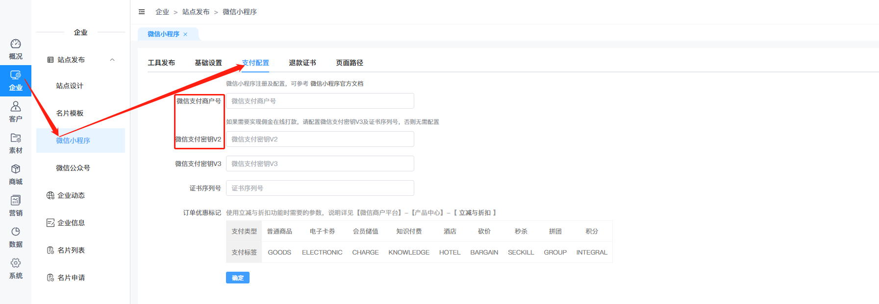 六、打开燃客名片后台的【企业】-【微信小程序】-【微信支付】页面,填写商户号和支付密钥v2,【确定】保存即可。