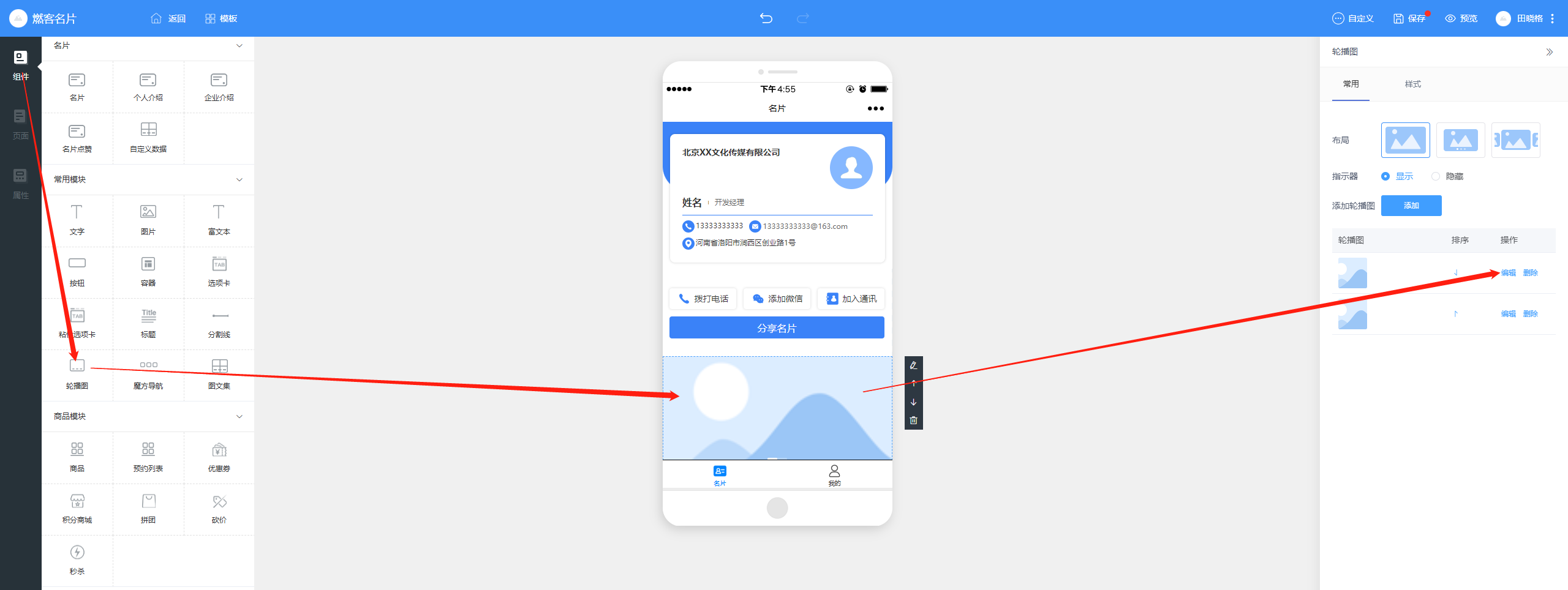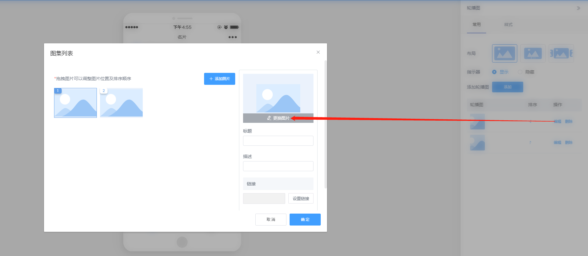 二、组件---直接将轮播图组件拖拽到设计页面, 选中轮播图,在右侧--编辑,【轮播图尺寸宽度750px 高度不限】