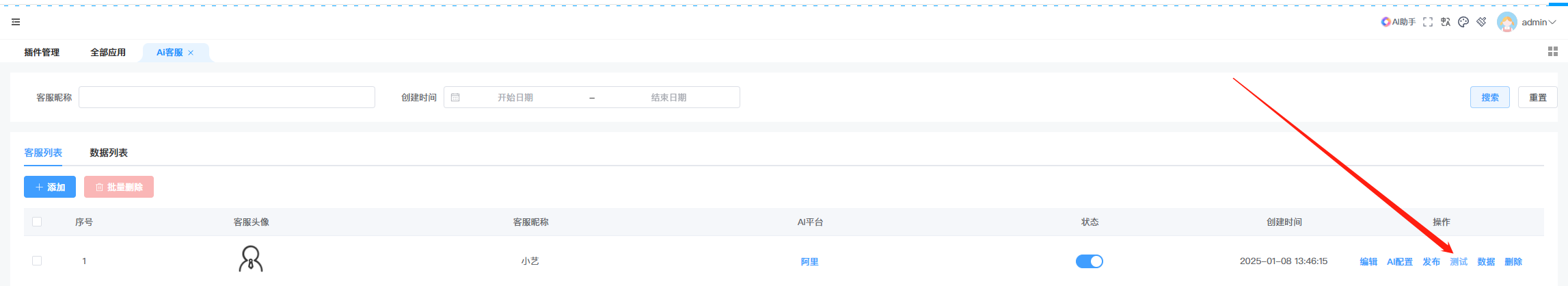 八、配置之后,在后台客服列表,可以点击测试,测试一下功能