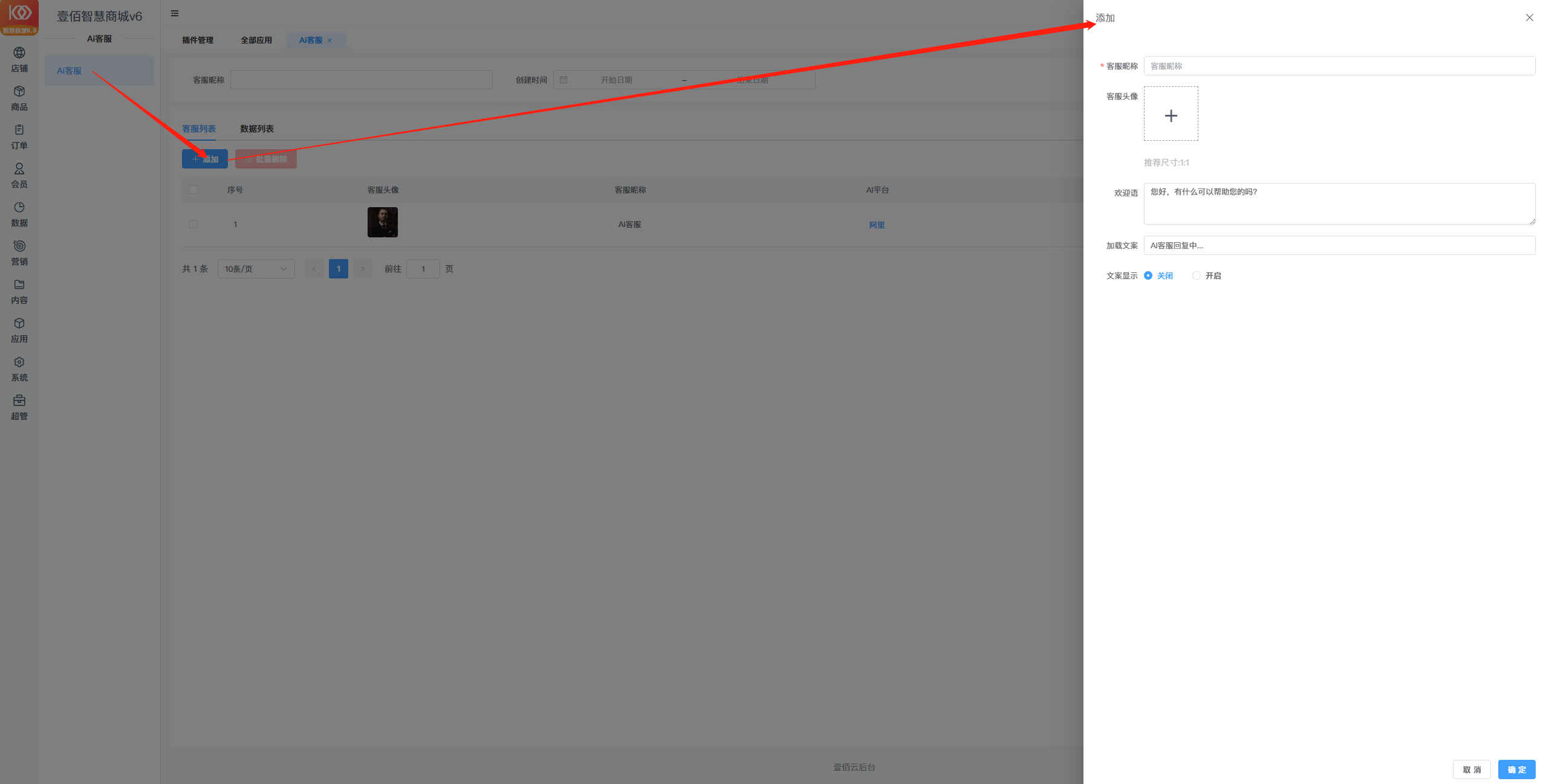 三、进入插件里面,在客服列表,填写客服昵称、设置头像、欢迎语等确定。